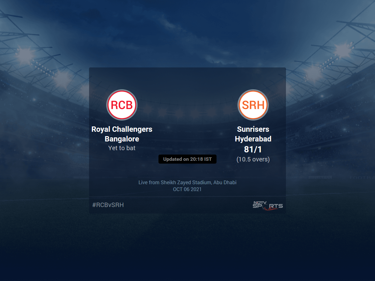A dedicated team of experts bring you live score, live cricket score, live match update on Sports.NDTV.com. After 10.5 overs, Sunrisers Hyderabad are 81/1. The live updates of Royal Challengers Bangalore vs Sunrisers Hyderabad scorecard is also available. It is the perfect platform to follow your favourite teams in Indian Premier League 2021. Keep a track on your favourite batsmen and bowlers through Indian Premier League 2021 today match, ball by ball commentary, Royal Challengers Bangalore vs Sunrisers Hyderabad, Royal Challengers Bangalore vs Sunrisers Hyderabad live score, Royal Challengers Bangalore vs Sunrisers Hyderabad scorecard. Follow the excitement of the Indian Premier League 2021 on Sports.NDTV.com as you can follow live match updates and live cricket score through our platform.