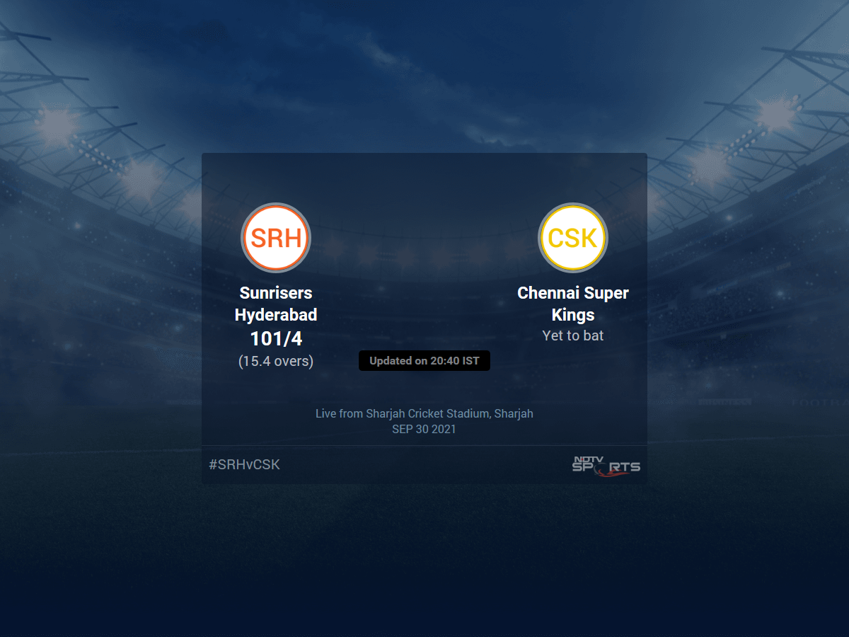 A dedicated team of experts bring you live score, live cricket score, live match update on Sports.NDTV.com. After 15.4 overs, Sunrisers Hyderabad are 101/4. The live updates of Sunrisers Hyderabad vs Chennai Super Kings scorecard is also available. It is the perfect platform to follow your favourite teams in Indian Premier League 2021. Keep a track on your favourite batsmen and bowlers through Indian Premier League 2021 today match, ball by ball commentary, Sunrisers Hyderabad vs Chennai Super Kings, Sunrisers Hyderabad vs Chennai Super Kings live score, Sunrisers Hyderabad vs Chennai Super Kings scorecard. Follow the excitement of the Indian Premier League 2021 on Sports.NDTV.com as you can follow live match updates and live cricket score through our platform.