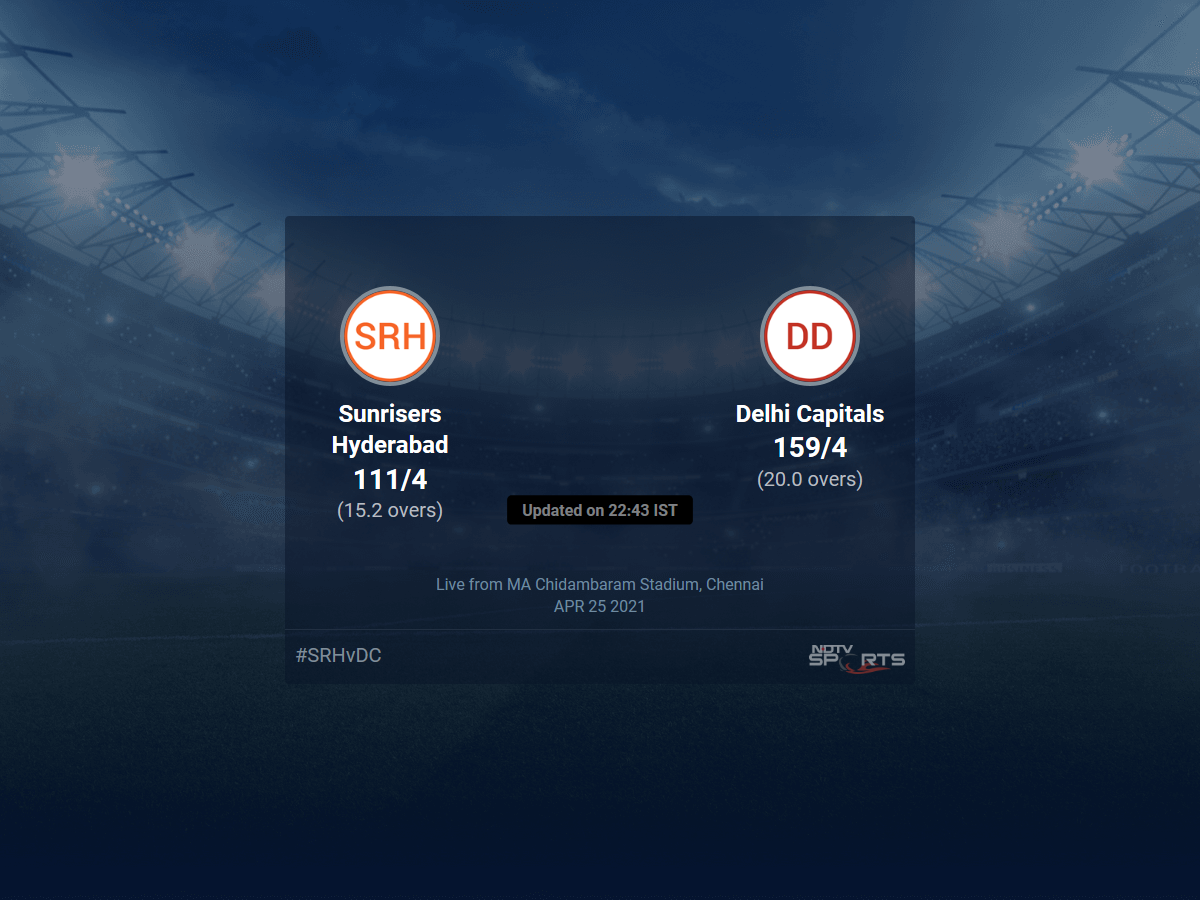 A dedicated team of experts bring you live score, live cricket score, live match update on Sports.NDTV.com. After 15.2 overs, Sunrisers Hyderabad, chasing a target of 160, are 111/4. The live updates of Sunrisers Hyderabad vs Delhi Capitals scorecard is also available. It is the perfect platform to follow your favourite teams in Indian Premier League 2021. Keep a track on your favourite batsmen and bowlers through Indian Premier League 2021 today match, ball by ball commentary, Sunrisers Hyderabad vs Delhi Capitals, Sunrisers Hyderabad vs Delhi Capitals live score, Sunrisers Hyderabad vs Delhi Capitals scorecard. Follow the excitement of the Indian Premier League 2021 on Sports.NDTV.com as you can follow live match updates and live cricket score through our platform.