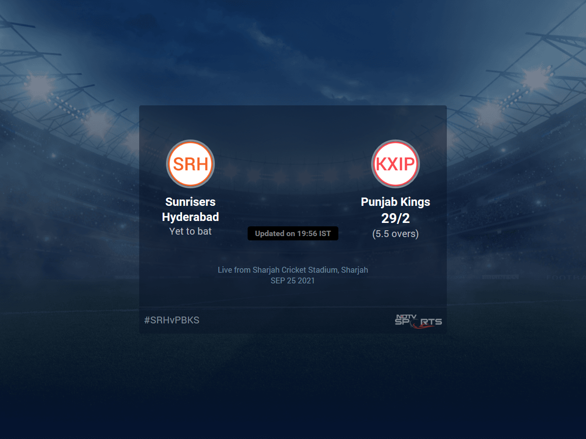 A dedicated team of experts bring you live score, live cricket score, live match update on Sports.NDTV.com. After 5.5 overs, Punjab Kings are 29/2. The live updates of Sunrisers Hyderabad vs Punjab Kings scorecard is also available. It is the perfect platform to follow your favourite teams in Indian Premier League 2021. Keep a track on your favourite batsmen and bowlers through Indian Premier League 2021 today match, ball by ball commentary, Sunrisers Hyderabad vs Punjab Kings, Sunrisers Hyderabad vs Punjab Kings live score, Sunrisers Hyderabad vs Punjab Kings scorecard. Follow the excitement of the Indian Premier League 2021 on Sports.NDTV.com as you can follow live match updates and live cricket score through our platform.