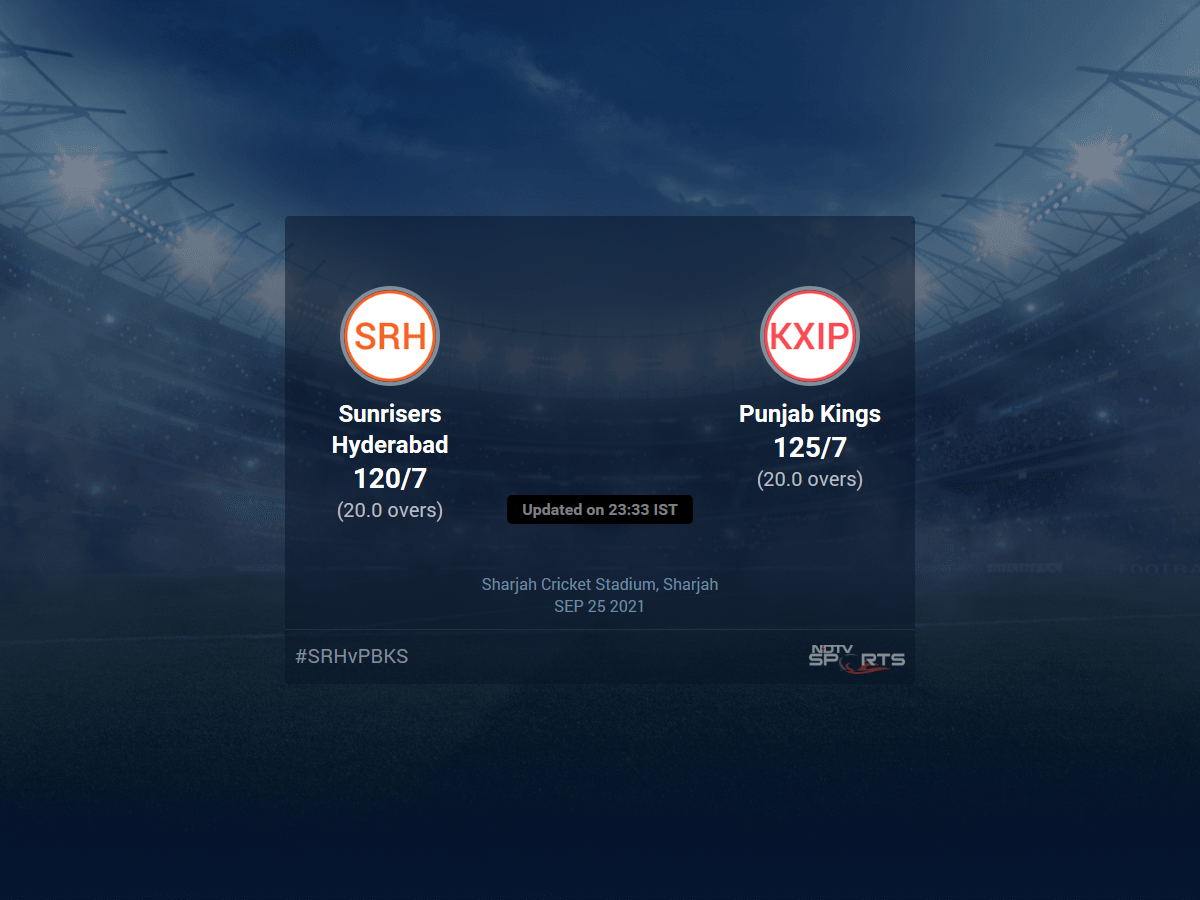 A dedicated team of experts bring you live score, live cricket score, live match update on Sports.NDTV.com. After 20.0 overs, Sunrisers Hyderabad, chasing a target of 126, are 120/7. The live updates of Sunrisers Hyderabad vs Punjab Kings scorecard is also available. It is the perfect platform to follow your favourite teams in Indian Premier League 2021. Keep a track on your favourite batsmen and bowlers through Indian Premier League 2021 today match, ball by ball commentary, Sunrisers Hyderabad vs Punjab Kings, Sunrisers Hyderabad vs Punjab Kings live score, Sunrisers Hyderabad vs Punjab Kings scorecard. Follow the excitement of the Indian Premier League 2021 on Sports.NDTV.com as you can follow live match updates and live cricket score through our platform.