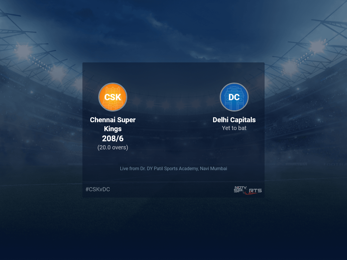 Follow the Indian Premier League 2022 live cricket score on Sports.NDTV.com. After 20.0 overs, Chennai Super Kings are 208/6. Get live score, ball by ball commentary and much more. Keep track of Indian Premier League 2022 today match between Chennai Super Kings and Delhi Capitals. Everything related to Chennai Super Kings and Delhi Capitals match will be available on Sports.NDTV.com. Stay updated with Chennai Super Kings vs Delhi Capitals live score. Do check for Chennai Super Kings vs Delhi Capitals scorecard. You can get scorecard updates, match related facts. Get quick live updates with ads, Sports.NDTV.com, which is the perfect destination for live cricket score.