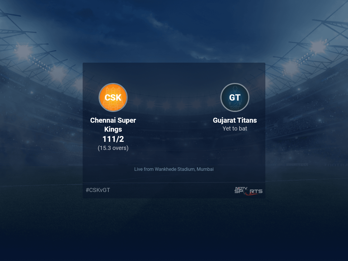 Follow the Indian Premier League 2022 live cricket score on Sports.NDTV.com. After 15.3 overs, Chennai Super Kings are 111/2. Get live score, ball by ball commentary and much more. Keep track of Indian Premier League 2022 today match between Chennai Super Kings and Gujarat Titans. Everything related to Chennai Super Kings and Gujarat Titans match will be available on Sports.NDTV.com. Stay updated with Chennai Super Kings vs Gujarat Titans live score. Do check for Chennai Super Kings vs Gujarat Titans scorecard. You can get scorecard updates, match related facts. Get quick live updates with ads, Sports.NDTV.com, which is the perfect destination for live cricket score.