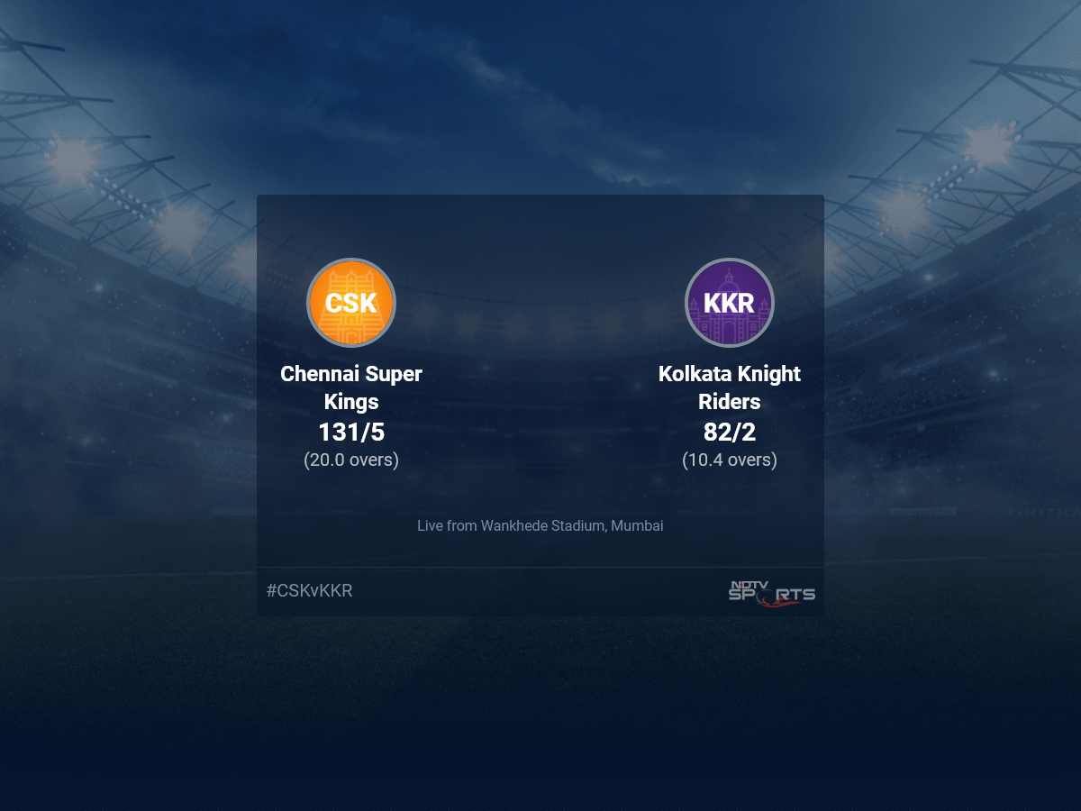 Follow the Indian Premier League 2022 live cricket score on Sports.NDTV.com. After 10.4 overs, Kolkata Knight Riders, chasing a target of 132, are 82/2. Get live score, ball by ball commentary and much more. Keep track of Indian Premier League 2022 today match between Chennai Super Kings and Kolkata Knight Riders. Everything related to Chennai Super Kings and Kolkata Knight Riders match will be available on Sports.NDTV.com. Stay updated with Chennai Super Kings vs Kolkata Knight Riders live score. Do check for Chennai Super Kings vs Kolkata Knight Riders scorecard. You can get scorecard updates, match related facts. Get quick live updates with ads, Sports.NDTV.com, which is the perfect destination for live cricket score.