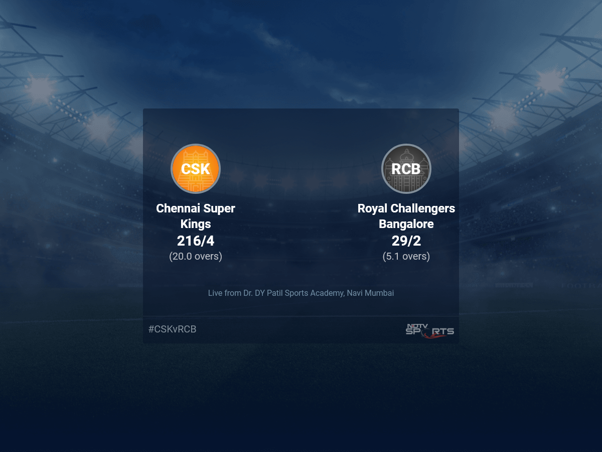 A dedicated team of experts bring you live score, live cricket score, live match update on Sports.NDTV.com. After 5.1 overs, Royal Challengers Bangalore, chasing a target of 217, are 29/2. The live updates of Chennai Super Kings vs Royal Challengers Bangalore scorecard is also available. It is the perfect platform to follow your favourite teams in Indian Premier League 2022. Keep a track on your favourite batsmen and bowlers through Indian Premier League 2022 today match, ball by ball commentary, Chennai Super Kings vs Royal Challengers Bangalore, Chennai Super Kings vs Royal Challengers Bangalore live score, Chennai Super Kings vs Royal Challengers Bangalore scorecard. Follow the excitement of the Indian Premier League 2022 on Sports.NDTV.com as you can follow live match updates and live cricket score through our platform.
