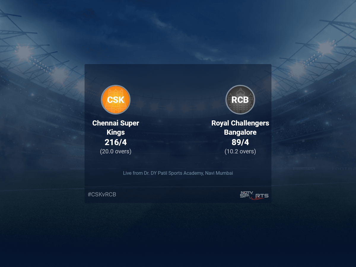 A dedicated team of experts bring you live score, live cricket score, live match update on Sports.NDTV.com. After 10.2 overs, Royal Challengers Bangalore, chasing a target of 217, are 89/4. The live updates of Chennai Super Kings vs Royal Challengers Bangalore scorecard is also available. It is the perfect platform to follow your favourite teams in Indian Premier League 2022. Keep a track on your favourite batsmen and bowlers through Indian Premier League 2022 today match, ball by ball commentary, Chennai Super Kings vs Royal Challengers Bangalore, Chennai Super Kings vs Royal Challengers Bangalore live score, Chennai Super Kings vs Royal Challengers Bangalore scorecard. Follow the excitement of the Indian Premier League 2022 on Sports.NDTV.com as you can follow live match updates and live cricket score through our platform.