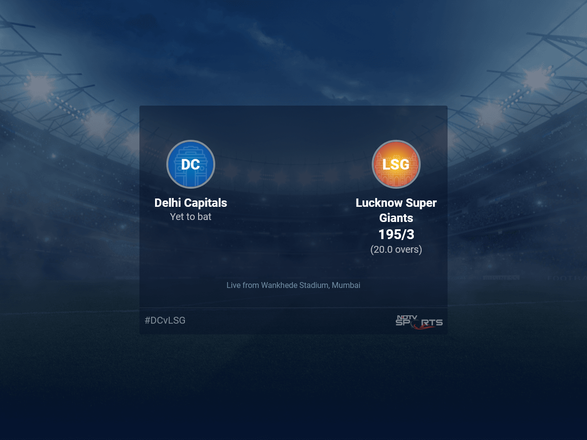 Follow the Indian Premier League 2022 live cricket score on Sports.NDTV.com. After 20.0 overs, Lucknow Super Giants are 195/3. Get live score, ball by ball commentary and much more. Keep track of Indian Premier League 2022 today match between Delhi Capitals and Lucknow Super Giants. Everything related to Delhi Capitals and Lucknow Super Giants match will be available on Sports.NDTV.com. Stay updated with Delhi Capitals vs Lucknow Super Giants live score. Do check for Delhi Capitals vs Lucknow Super Giants scorecard. You can get scorecard updates, match related facts. Get quick live updates with ads, Sports.NDTV.com, which is the perfect destination for live cricket score.