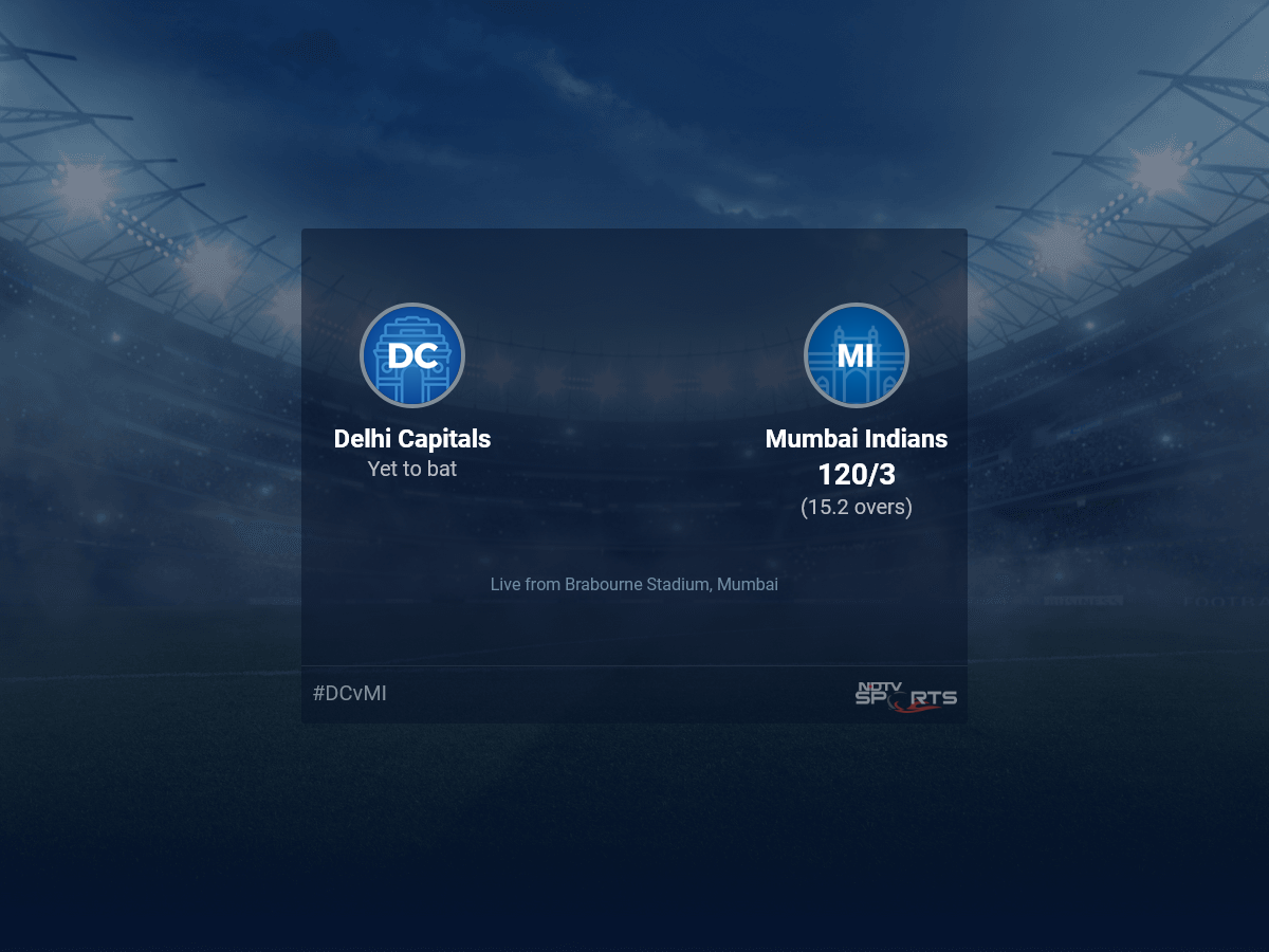 Follow the Indian Premier League 2022 live cricket score on Sports.NDTV.com. After 15.2 overs, Mumbai Indians are 120/3. Get live score, ball by ball commentary and much more. Keep track of Indian Premier League 2022 today match between Delhi Capitals and Mumbai Indians. Everything related to Delhi Capitals and Mumbai Indians match will be available on Sports.NDTV.com. Stay updated with Delhi Capitals vs Mumbai Indians live score. Do check for Delhi Capitals vs Mumbai Indians scorecard. You can get scorecard updates, match related facts. Get quick live updates with ads, Sports.NDTV.com, which is the perfect destination for live cricket score.