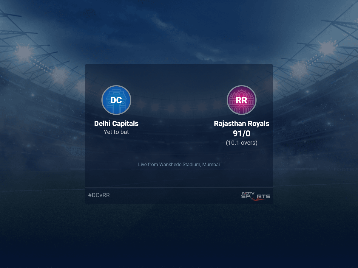 A dedicated team of experts bring you live score, live cricket score, live match update on Sports.NDTV.com. After 10.1 overs, Rajasthan Royals are 91/0. The live updates of Delhi Capitals vs Rajasthan Royals scorecard is also available. It is the perfect platform to follow your favourite teams in Indian Premier League 2022. Keep a track on your favourite batsmen and bowlers through Indian Premier League 2022 today match, ball by ball commentary, Delhi Capitals vs Rajasthan Royals, Delhi Capitals vs Rajasthan Royals live score, Delhi Capitals vs Rajasthan Royals scorecard. Follow the excitement of the Indian Premier League 2022 on Sports.NDTV.com as you can follow live match updates and live cricket score through our platform.