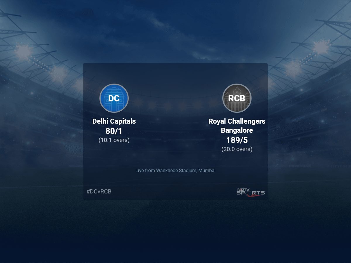 A dedicated team of experts bring you live score, live cricket score, live match update on Sports.NDTV.com. After 10.1 overs, Delhi Capitals, chasing a target of 190, are 80/1. The live updates of Delhi Capitals vs Royal Challengers Bangalore scorecard is also available. It is the perfect platform to follow your favourite teams in Indian Premier League 2022. Keep a track on your favourite batsmen and bowlers through Indian Premier League 2022 today match, ball by ball commentary, Delhi Capitals vs Royal Challengers Bangalore, Delhi Capitals vs Royal Challengers Bangalore live score, Delhi Capitals vs Royal Challengers Bangalore scorecard. Follow the excitement of the Indian Premier League 2022 on Sports.NDTV.com as you can follow live match updates and live cricket score through our platform.