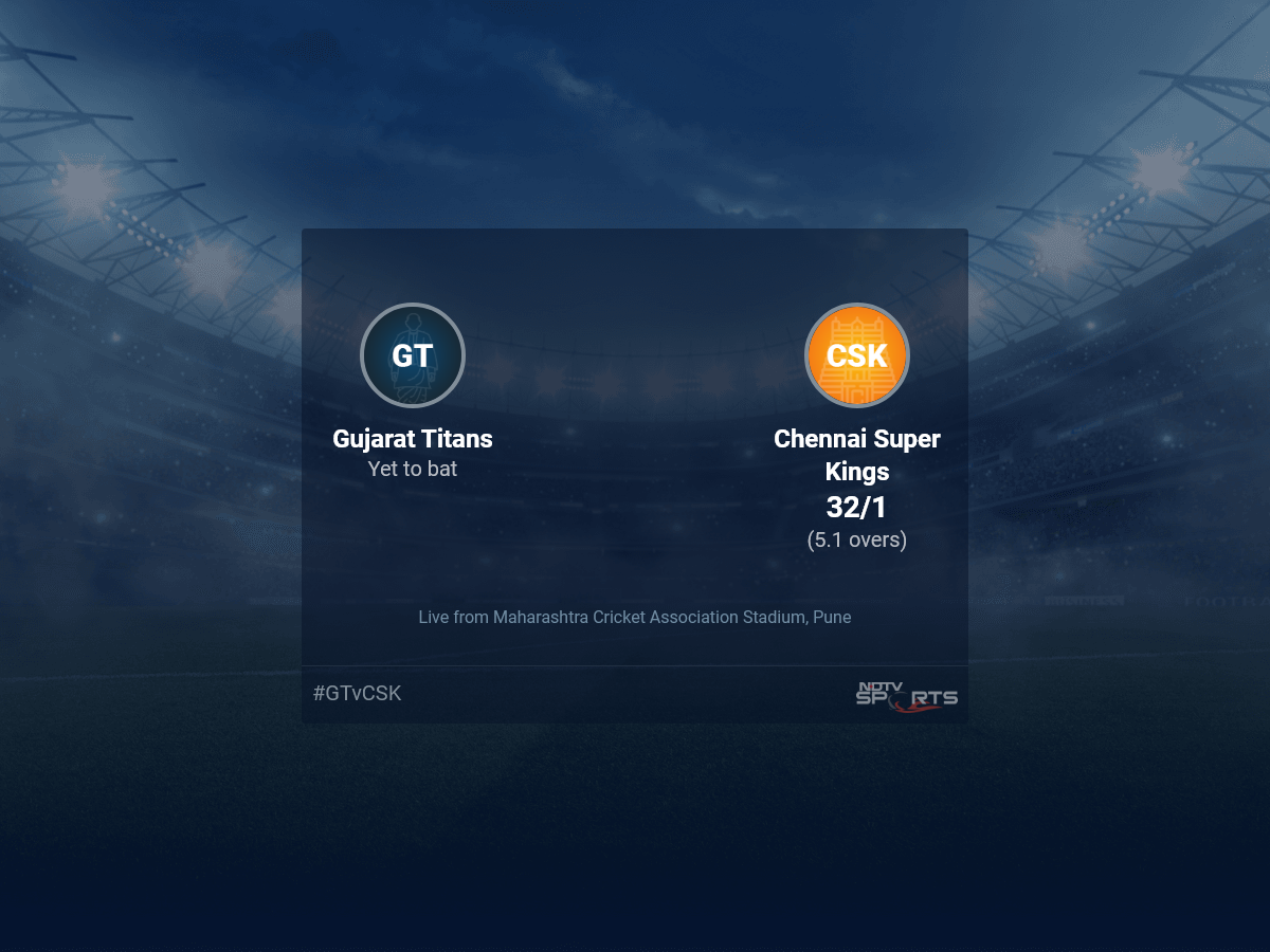 Follow the Indian Premier League 2022 live cricket score on Sports.NDTV.com. After 5.1 overs, Chennai Super Kings are 32/1. Get live score, ball by ball commentary and much more. Keep track of Indian Premier League 2022 today match between Gujarat Titans and Chennai Super Kings. Everything related to Gujarat Titans and Chennai Super Kings match will be available on Sports.NDTV.com. Stay updated with Gujarat Titans vs Chennai Super Kings live score. Do check for Gujarat Titans vs Chennai Super Kings scorecard. You can get scorecard updates, match related facts. Get quick live updates with ads, Sports.NDTV.com, which is the perfect destination for live cricket score.