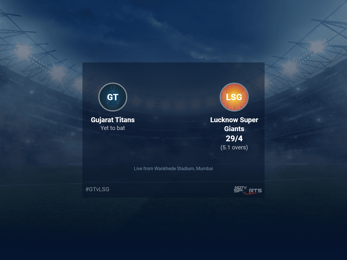 A dedicated team of experts bring you live score, live cricket score, live match update on Sports.NDTV.com. After 5.1 overs, Lucknow Super Giants are 29/4. The live updates of Gujarat Titans vs Lucknow Super Giants scorecard is also available. It is the perfect platform to follow your favourite teams in Indian Premier League 2022. Keep a track on your favourite batsmen and bowlers through Indian Premier League 2022 today match, ball by ball commentary, Gujarat Titans vs Lucknow Super Giants, Gujarat Titans vs Lucknow Super Giants live score, Gujarat Titans vs Lucknow Super Giants scorecard. Follow the excitement of the Indian Premier League 2022 on Sports.NDTV.com as you can follow live match updates and live cricket score through our platform.