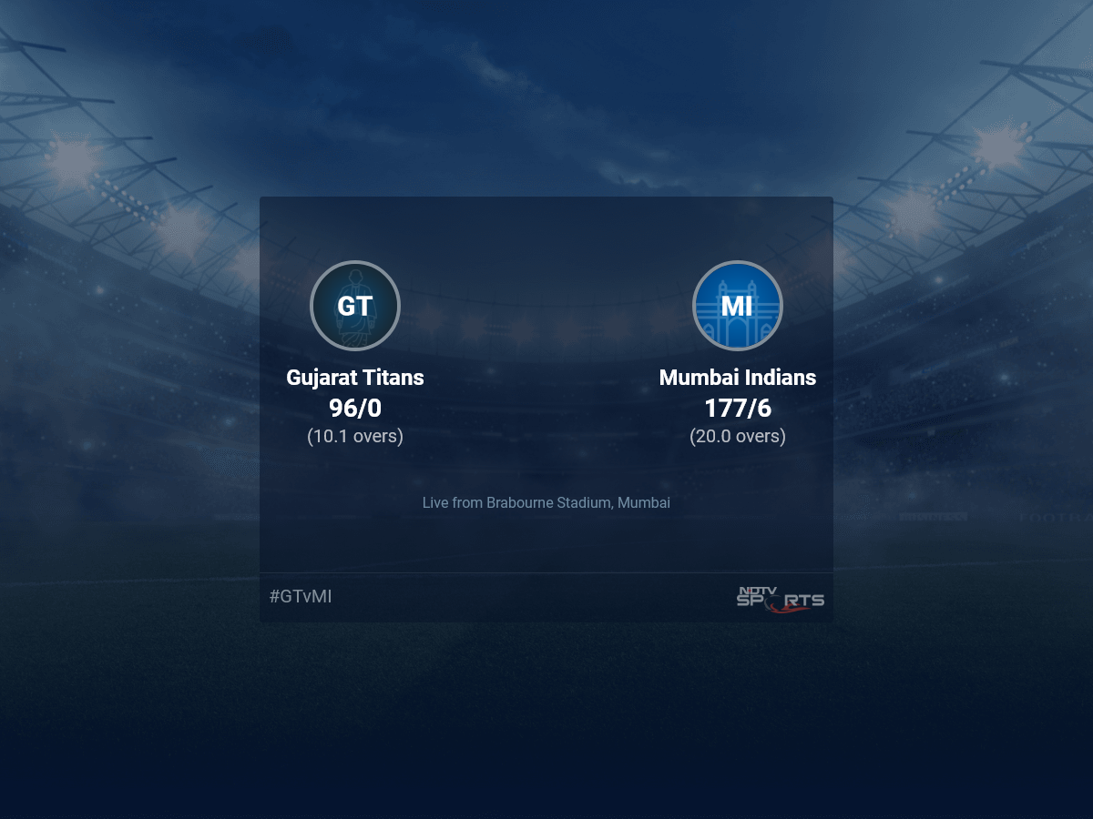 A dedicated team of experts bring you live score, live cricket score, live match update on Sports.NDTV.com. After 10.1 overs, Gujarat Titans, chasing a target of 178, are 96/0. The live updates of Gujarat Titans vs Mumbai Indians scorecard is also available. It is the perfect platform to follow your favourite teams in Indian Premier League 2022. Keep a track on your favourite batsmen and bowlers through Indian Premier League 2022 today match, ball by ball commentary, Gujarat Titans vs Mumbai Indians, Gujarat Titans vs Mumbai Indians live score, Gujarat Titans vs Mumbai Indians scorecard. Follow the excitement of the Indian Premier League 2022 on Sports.NDTV.com as you can follow live match updates and live cricket score through our platform.
