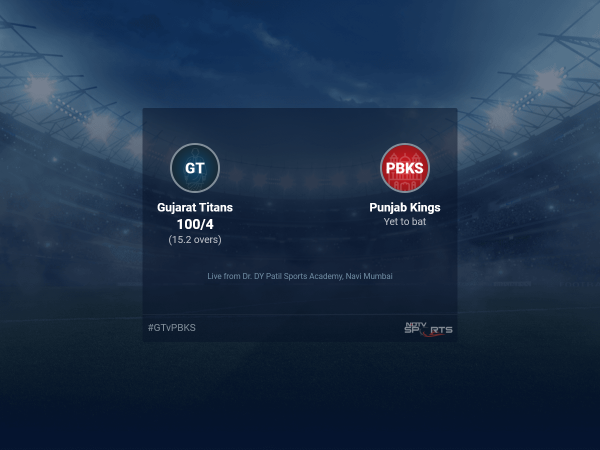 A dedicated team of experts bring you live score, live cricket score, live match update on Sports.NDTV.com. After 15.2 overs, Gujarat Titans are 100/4. The live updates of Gujarat Titans vs Punjab Kings scorecard is also available. It is the perfect platform to follow your favourite teams in Indian Premier League 2022. Keep a track on your favourite batsmen and bowlers through Indian Premier League 2022 today match, ball by ball commentary, Gujarat Titans vs Punjab Kings, Gujarat Titans vs Punjab Kings live score, Gujarat Titans vs Punjab Kings scorecard. Follow the excitement of the Indian Premier League 2022 on Sports.NDTV.com as you can follow live match updates and live cricket score through our platform.