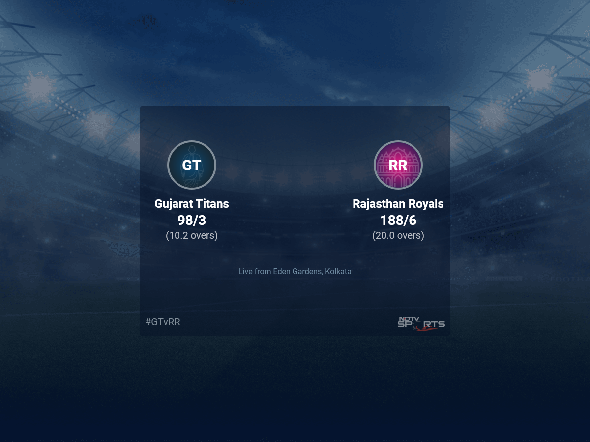 Follow the Indian Premier League 2022 live cricket score on Sports.NDTV.com. After 10.2 overs, Gujarat Titans, chasing a target of 189, are 98/3. Get live score, ball by ball commentary and much more. Keep track of Indian Premier League 2022 today match between Gujarat Titans and Rajasthan Royals. Everything related to Gujarat Titans and Rajasthan Royals match will be available on Sports.NDTV.com. Stay updated with Gujarat Titans vs Rajasthan Royals live score. Do check for Gujarat Titans vs Rajasthan Royals scorecard. You can get scorecard updates, match related facts. Get quick live updates with ads, Sports.NDTV.com, which is the perfect destination for live cricket score.