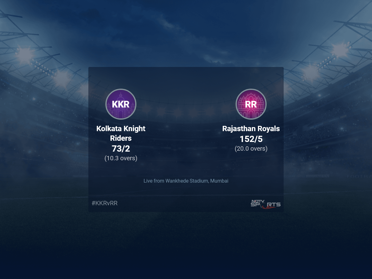 A dedicated team of experts bring you live score, live cricket score, live match update on Sports.NDTV.com. After 10.3 overs, Kolkata Knight Riders, chasing a target of 153, are 73/2. The live updates of Kolkata Knight Riders vs Rajasthan Royals scorecard is also available. It is the perfect platform to follow your favourite teams in Indian Premier League 2022. Keep a track on your favourite batsmen and bowlers through Indian Premier League 2022 today match, ball by ball commentary, Kolkata Knight Riders vs Rajasthan Royals, Kolkata Knight Riders vs Rajasthan Royals live score, Kolkata Knight Riders vs Rajasthan Royals scorecard. Follow the excitement of the Indian Premier League 2022 on Sports.NDTV.com as you can follow live match updates and live cricket score through our platform.