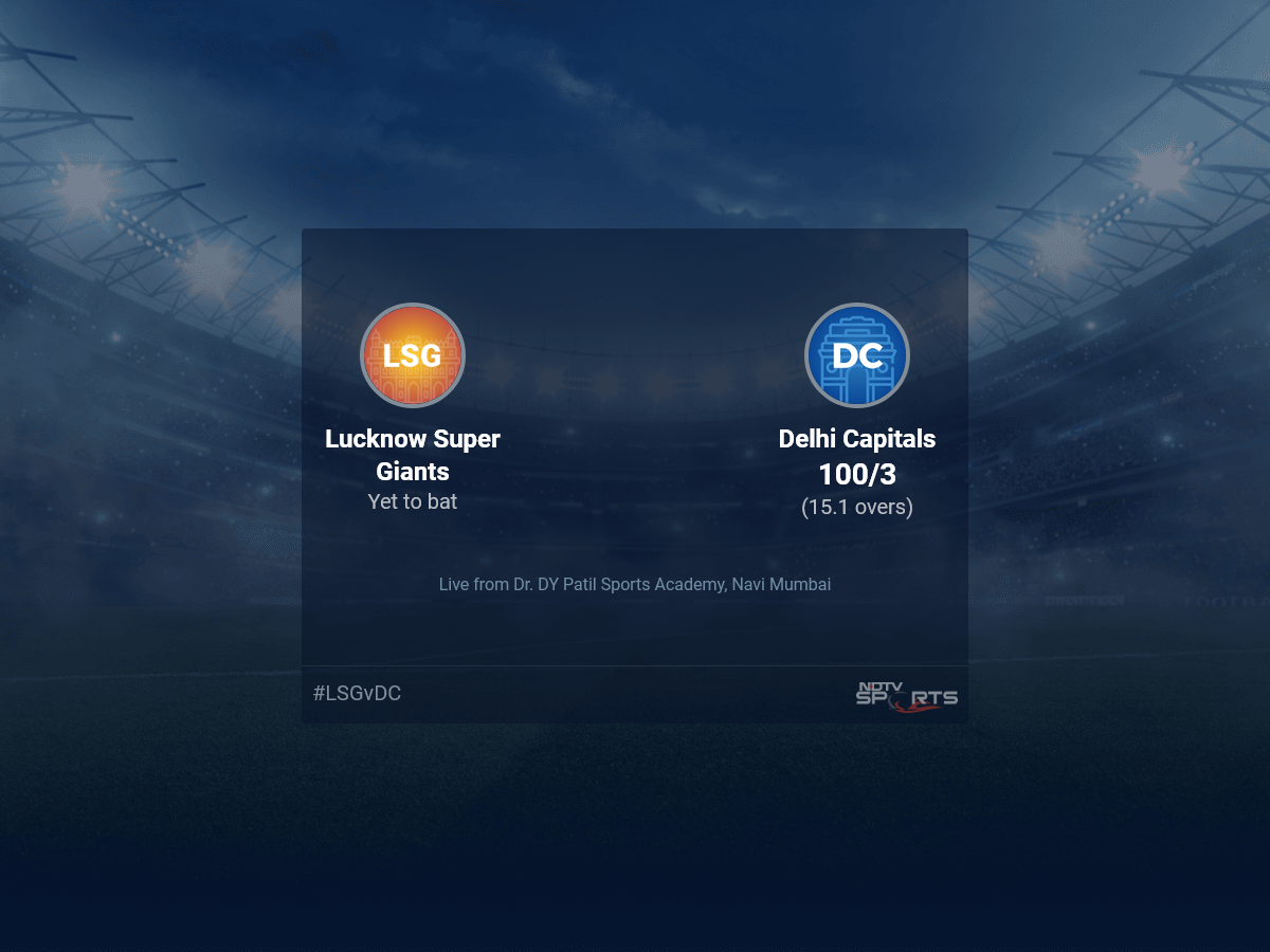 A dedicated team of experts bring you live score, live cricket score, live match update on Sports.NDTV.com. After 15.1 overs, Delhi Capitals are 100/3. The live updates of Lucknow Super Giants vs Delhi Capitals scorecard is also available. It is the perfect platform to follow your favourite teams in Indian Premier League 2022. Keep a track on your favourite batsmen and bowlers through Indian Premier League 2022 today match, ball by ball commentary, Lucknow Super Giants vs Delhi Capitals, Lucknow Super Giants vs Delhi Capitals live score, Lucknow Super Giants vs Delhi Capitals scorecard. Follow the excitement of the Indian Premier League 2022 on Sports.NDTV.com as you can follow live match updates and live cricket score through our platform.