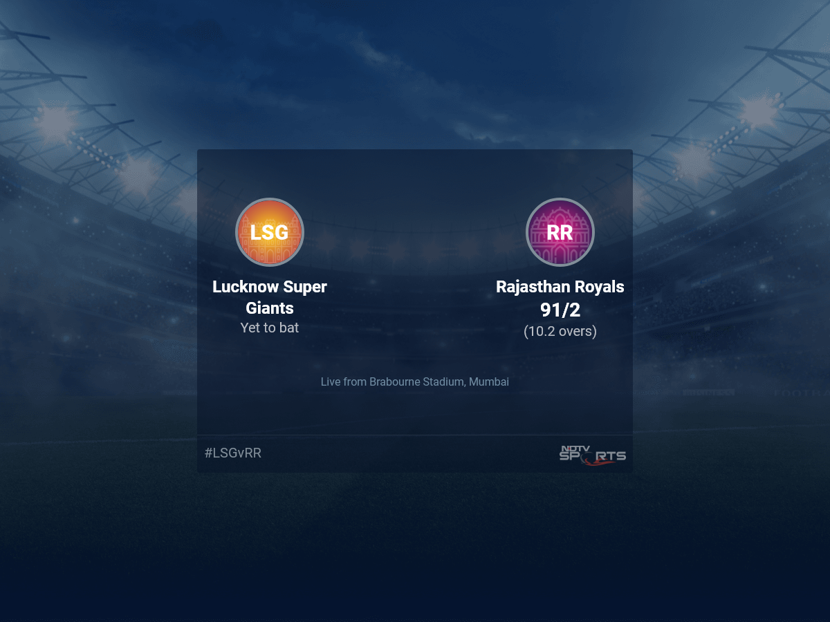 A dedicated team of experts bring you live score, live cricket score, live match update on Sports.NDTV.com. After 10.2 overs, Rajasthan Royals are 91/2. The live updates of Lucknow Super Giants vs Rajasthan Royals scorecard is also available. It is the perfect platform to follow your favourite teams in Indian Premier League 2022. Keep a track on your favourite batsmen and bowlers through Indian Premier League 2022 today match, ball by ball commentary, Lucknow Super Giants vs Rajasthan Royals, Lucknow Super Giants vs Rajasthan Royals live score, Lucknow Super Giants vs Rajasthan Royals scorecard. Follow the excitement of the Indian Premier League 2022 on Sports.NDTV.com as you can follow live match updates and live cricket score through our platform.