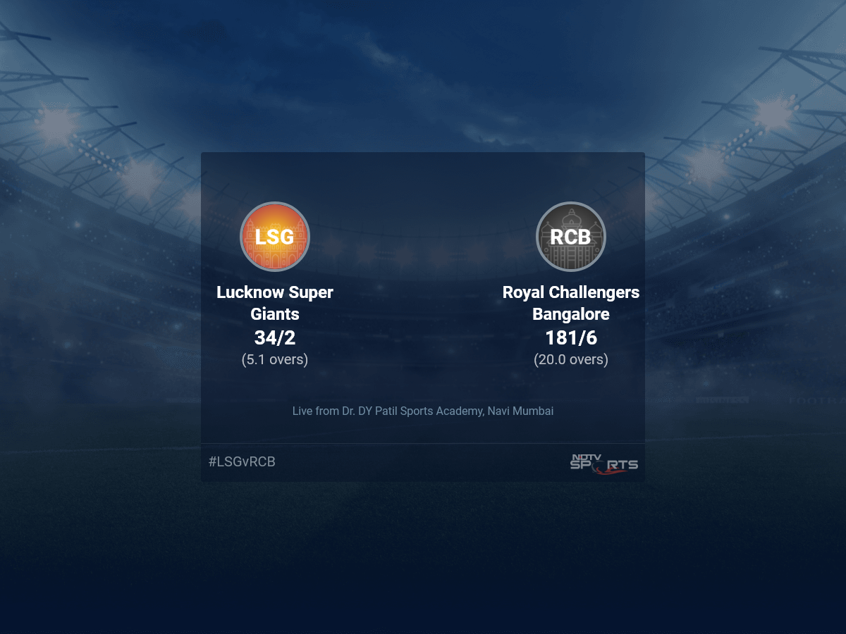 A dedicated team of experts bring you live score, live cricket score, live match update on Sports.NDTV.com. After 5.1 overs, Lucknow Super Giants, chasing a target of 182, are 34/2. The live updates of Lucknow Super Giants vs Royal Challengers Bangalore scorecard is also available. It is the perfect platform to follow your favourite teams in Indian Premier League 2022. Keep a track on your favourite batsmen and bowlers through Indian Premier League 2022 today match, ball by ball commentary, Lucknow Super Giants vs Royal Challengers Bangalore, Lucknow Super Giants vs Royal Challengers Bangalore live score, Lucknow Super Giants vs Royal Challengers Bangalore scorecard. Follow the excitement of the Indian Premier League 2022 on Sports.NDTV.com as you can follow live match updates and live cricket score through our platform.