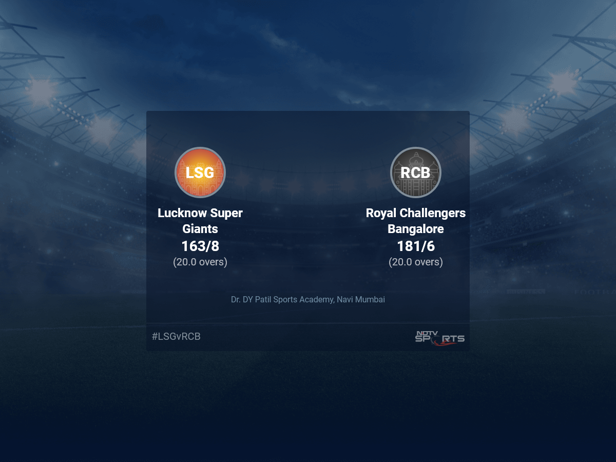 Follow the Indian Premier League 2022 live cricket score on Sports.NDTV.com. After 20.0 overs, Lucknow Super Giants, chasing a target of 182, are 163/8. Get live score, ball by ball commentary and much more. Keep track of Indian Premier League 2022 today match between Lucknow Super Giants and Royal Challengers Bangalore. Everything related to Lucknow Super Giants and Royal Challengers Bangalore match will be available on Sports.NDTV.com. Stay updated with Lucknow Super Giants vs Royal Challengers Bangalore live score. Do check for Lucknow Super Giants vs Royal Challengers Bangalore scorecard. You can get scorecard updates, match related facts. Get quick live updates with ads, Sports.NDTV.com, which is the perfect destination for live cricket score.