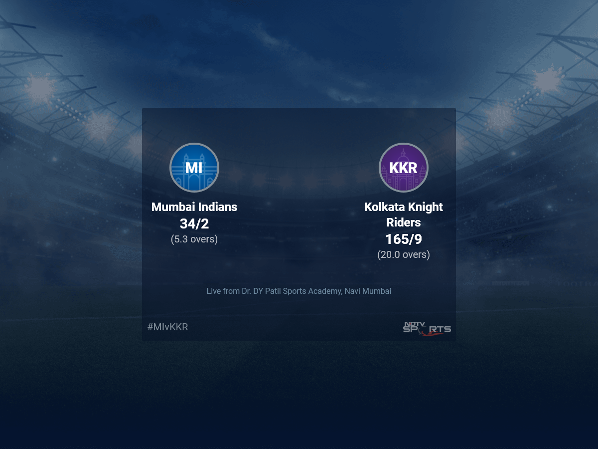 A dedicated team of experts bring you live score, live cricket score, live match update on Sports.NDTV.com. After 5.3 overs, Mumbai Indians, chasing a target of 166, are 34/2. The live updates of Mumbai Indians vs Kolkata Knight Riders scorecard is also available. It is the perfect platform to follow your favourite teams in Indian Premier League 2022. Keep a track on your favourite batsmen and bowlers through Indian Premier League 2022 today match, ball by ball commentary, Mumbai Indians vs Kolkata Knight Riders, Mumbai Indians vs Kolkata Knight Riders live score, Mumbai Indians vs Kolkata Knight Riders scorecard. Follow the excitement of the Indian Premier League 2022 on Sports.NDTV.com as you can follow live match updates and live cricket score through our platform.