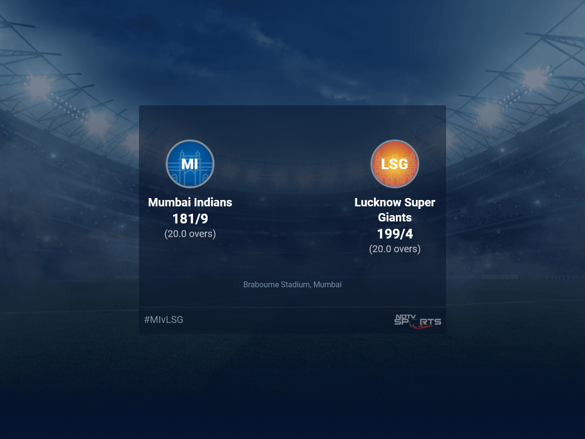 A dedicated team of experts bring you live score, live cricket score, live match update on Sports.NDTV.com. After 20.0 overs, Mumbai Indians, chasing a target of 200, are 181/9. The live updates of Mumbai Indians vs Lucknow Super Giants scorecard is also available. It is the perfect platform to follow your favourite teams in Indian Premier League 2022. Keep a track on your favourite batsmen and bowlers through Indian Premier League 2022 today match, ball by ball commentary, Mumbai Indians vs Lucknow Super Giants, Mumbai Indians vs Lucknow Super Giants live score, Mumbai Indians vs Lucknow Super Giants scorecard. Follow the excitement of the Indian Premier League 2022 on Sports.NDTV.com as you can follow live match updates and live cricket score through our platform.