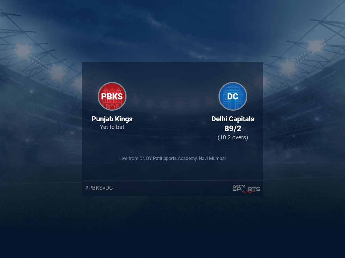 Follow the Indian Premier League 2022 live cricket score on Sports.NDTV.com. After 10.2 overs, Delhi Capitals are 89/2. Get live score, ball by ball commentary and much more. Keep track of Indian Premier League 2022 today match between Punjab Kings and Delhi Capitals. Everything related to Punjab Kings and Delhi Capitals match will be available on Sports.NDTV.com. Stay updated with Punjab Kings vs Delhi Capitals live score. Do check for Punjab Kings vs Delhi Capitals scorecard. You can get scorecard updates, match related facts. Get quick live updates with ads, Sports.NDTV.com, which is the perfect destination for live cricket score.