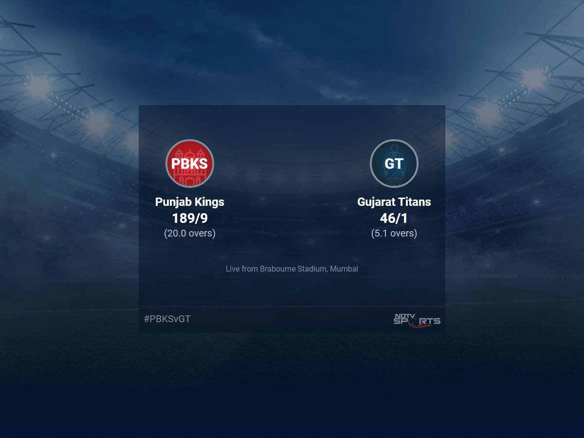 Follow the Indian Premier League 2022 live cricket score on Sports.NDTV.com. After 5.1 overs, Gujarat Titans, chasing a target of 190, are 46/1. Get live score, ball by ball commentary and much more. Keep track of Indian Premier League 2022 today match between Punjab Kings and Gujarat Titans. Everything related to Punjab Kings and Gujarat Titans match will be available on Sports.NDTV.com. Stay updated with Punjab Kings vs Gujarat Titans live score. Do check for Punjab Kings vs Gujarat Titans scorecard. You can get scorecard updates, match related facts. Get quick live updates with ads, Sports.NDTV.com, which is the perfect destination for live cricket score.