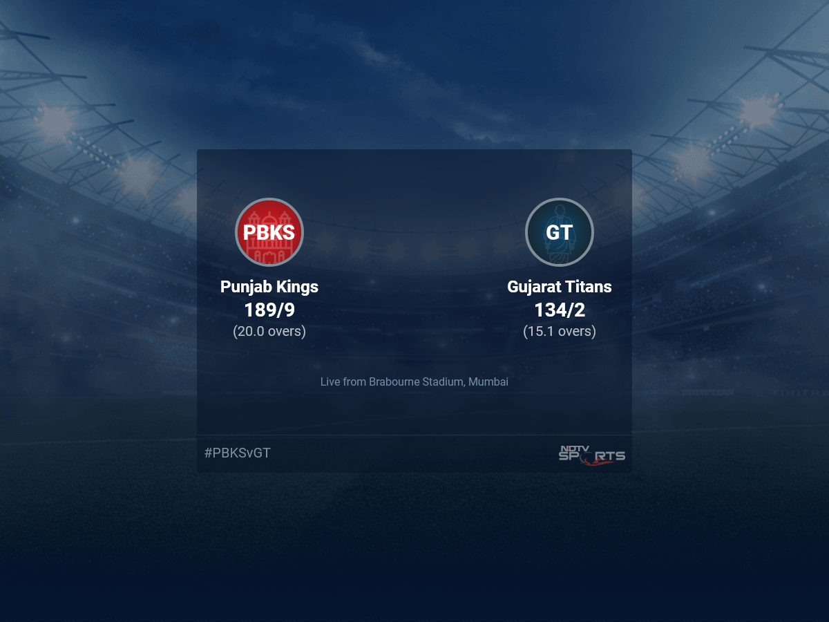 Follow the Indian Premier League 2022 live cricket score on Sports.NDTV.com. After 15.1 overs, Gujarat Titans, chasing a target of 190, are 134/2. Get live score, ball by ball commentary and much more. Keep track of Indian Premier League 2022 today match between Punjab Kings and Gujarat Titans. Everything related to Punjab Kings and Gujarat Titans match will be available on Sports.NDTV.com. Stay updated with Punjab Kings vs Gujarat Titans live score. Do check for Punjab Kings vs Gujarat Titans scorecard. You can get scorecard updates, match related facts. Get quick live updates with ads, Sports.NDTV.com, which is the perfect destination for live cricket score.
