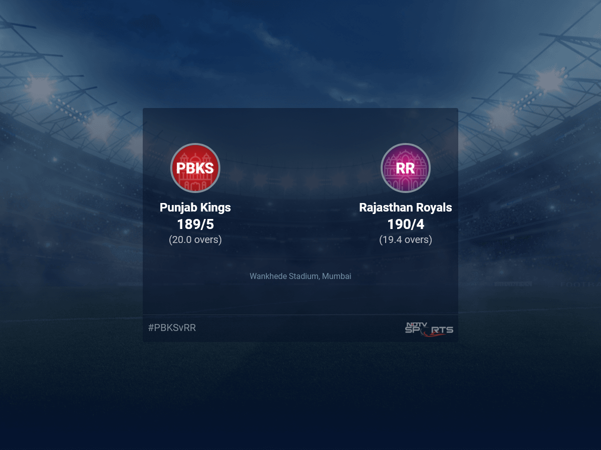 A dedicated team of experts bring you live score, live cricket score, live match update on Sports.NDTV.com. After 19.4 overs, Rajasthan Royals, chasing a target of 190, are 190/4. The live updates of Punjab Kings vs Rajasthan Royals scorecard is also available. It is the perfect platform to follow your favourite teams in Indian Premier League 2022. Keep a track on your favourite batsmen and bowlers through Indian Premier League 2022 today match, ball by ball commentary, Punjab Kings vs Rajasthan Royals, Punjab Kings vs Rajasthan Royals live score, Punjab Kings vs Rajasthan Royals scorecard. Follow the excitement of the Indian Premier League 2022 on Sports.NDTV.com as you can follow live match updates and live cricket score through our platform.