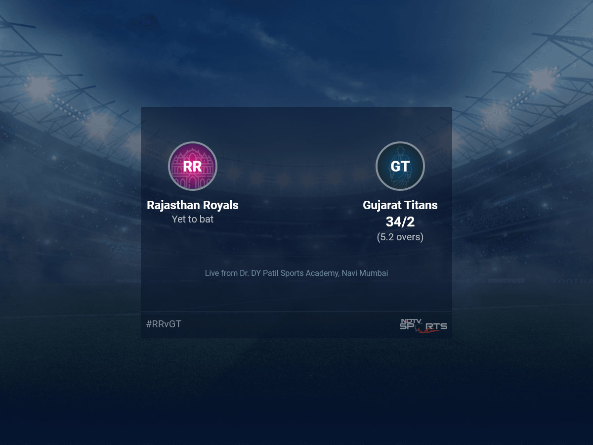 A dedicated team of experts bring you live score, live cricket score, live match update on Sports.NDTV.com. After 5.2 overs, Gujarat Titans are 34/2. The live updates of Rajasthan Royals vs Gujarat Titans scorecard is also available. It is the perfect platform to follow your favourite teams in Indian Premier League 2022. Keep a track on your favourite batsmen and bowlers through Indian Premier League 2022 today match, ball by ball commentary, Rajasthan Royals vs Gujarat Titans, Rajasthan Royals vs Gujarat Titans live score, Rajasthan Royals vs Gujarat Titans scorecard. Follow the excitement of the Indian Premier League 2022 on Sports.NDTV.com as you can follow live match updates and live cricket score through our platform.
