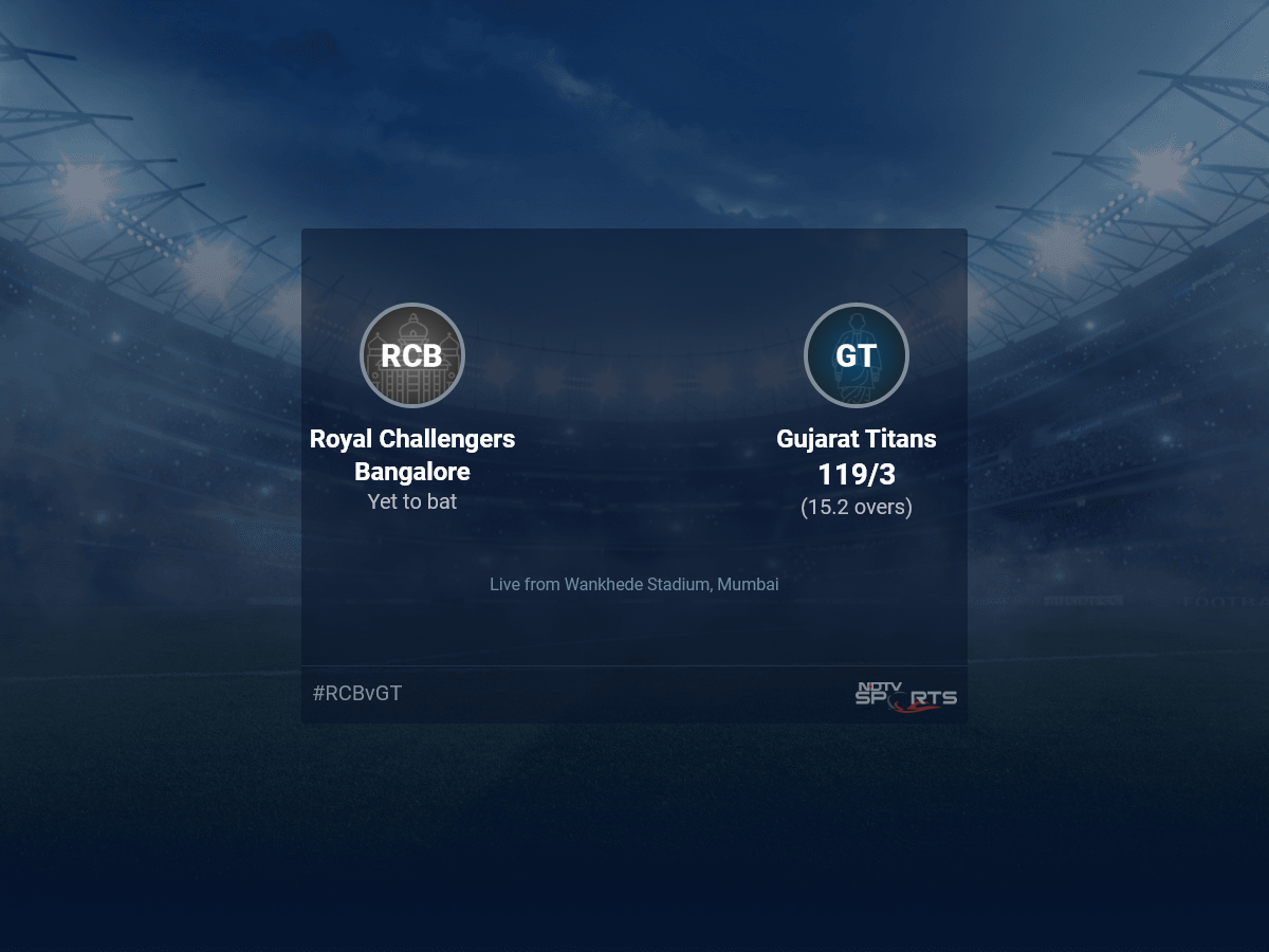 A dedicated team of experts bring you live score, live cricket score, live match update on Sports.NDTV.com. After 15.2 overs, Gujarat Titans are 119/3. The live updates of Royal Challengers Bangalore vs Gujarat Titans scorecard is also available. It is the perfect platform to follow your favourite teams in Indian Premier League 2022. Keep a track on your favourite batsmen and bowlers through Indian Premier League 2022 today match, ball by ball commentary, Royal Challengers Bangalore vs Gujarat Titans, Royal Challengers Bangalore vs Gujarat Titans live score, Royal Challengers Bangalore vs Gujarat Titans scorecard. Follow the excitement of the Indian Premier League 2022 on Sports.NDTV.com as you can follow live match updates and live cricket score through our platform.