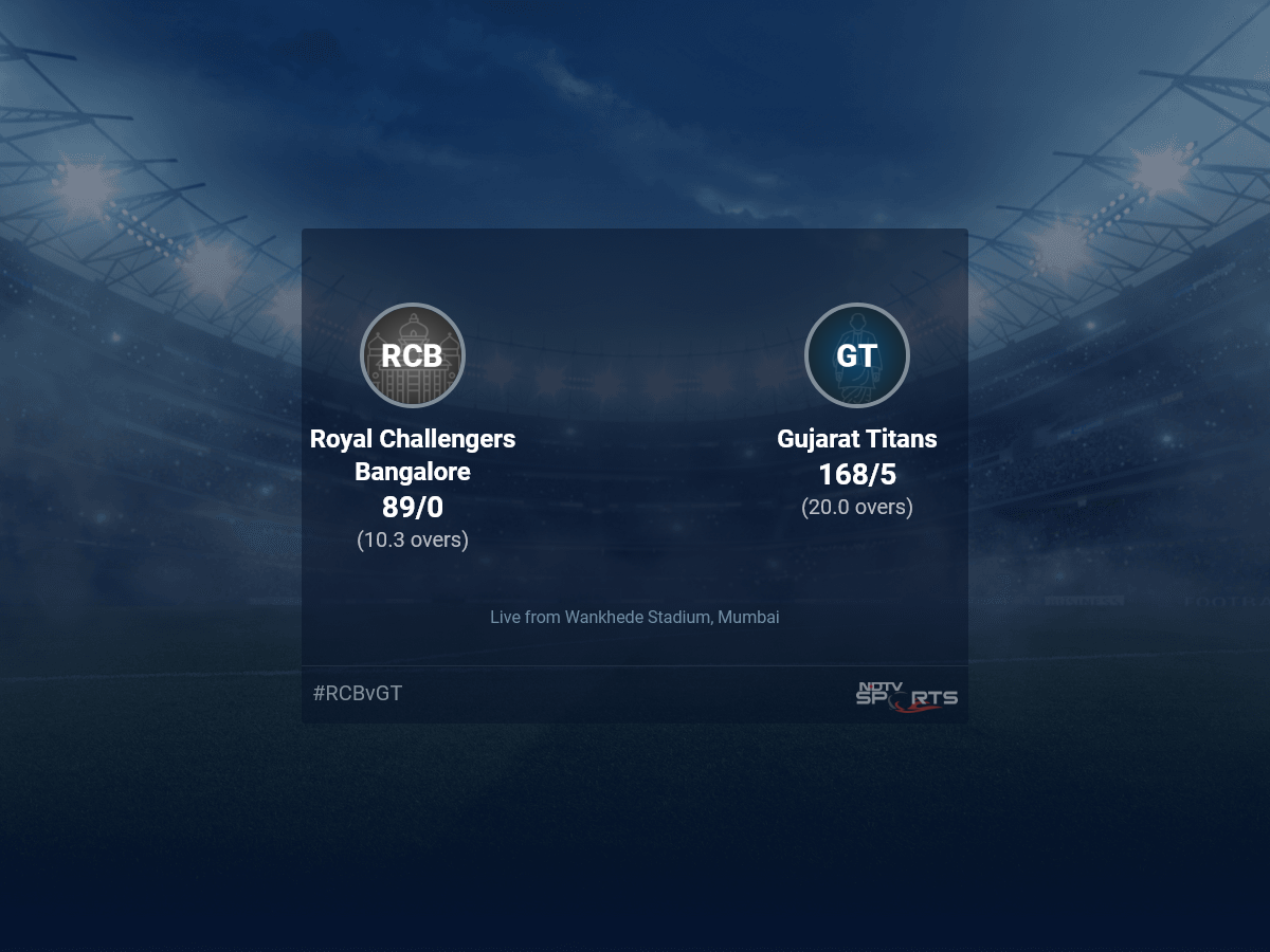 A dedicated team of experts bring you live score, live cricket score, live match update on Sports.NDTV.com. After 10.3 overs, Royal Challengers Bangalore, chasing a target of 169, are 89/0. The live updates of Royal Challengers Bangalore vs Gujarat Titans scorecard is also available. It is the perfect platform to follow your favourite teams in Indian Premier League 2022. Keep a track on your favourite batsmen and bowlers through Indian Premier League 2022 today match, ball by ball commentary, Royal Challengers Bangalore vs Gujarat Titans, Royal Challengers Bangalore vs Gujarat Titans live score, Royal Challengers Bangalore vs Gujarat Titans scorecard. Follow the excitement of the Indian Premier League 2022 on Sports.NDTV.com as you can follow live match updates and live cricket score through our platform.