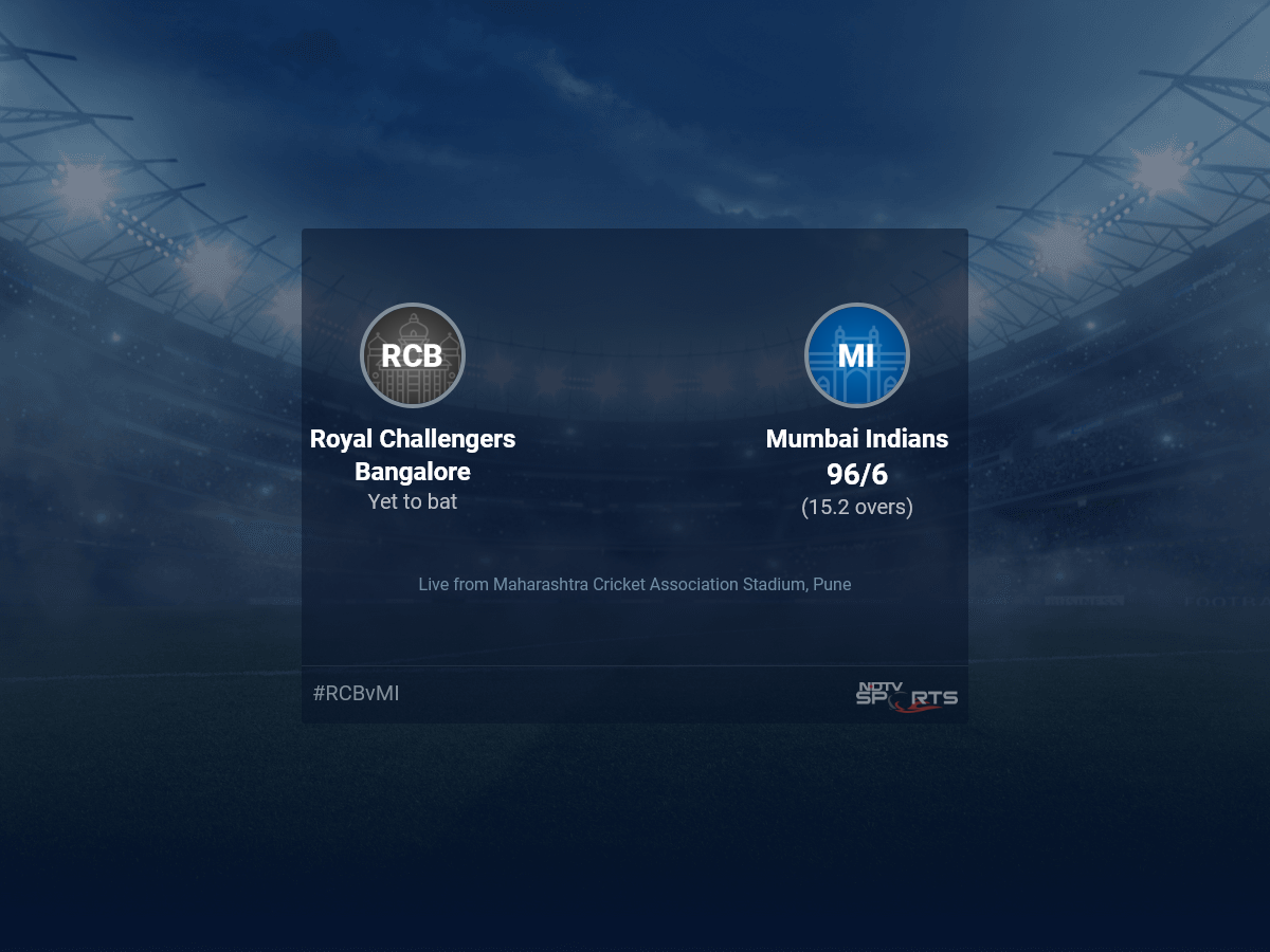 Follow the Indian Premier League 2022 live cricket score on Sports.NDTV.com. After 15.2 overs, Mumbai Indians are 96/6. Get live score, ball by ball commentary and much more. Keep track of Indian Premier League 2022 today match between Royal Challengers Bangalore and Mumbai Indians. Everything related to Royal Challengers Bangalore and Mumbai Indians match will be available on Sports.NDTV.com. Stay updated with Royal Challengers Bangalore vs Mumbai Indians live score. Do check for Royal Challengers Bangalore vs Mumbai Indians scorecard. You can get scorecard updates, match related facts. Get quick live updates with ads, Sports.NDTV.com, which is the perfect destination for live cricket score.