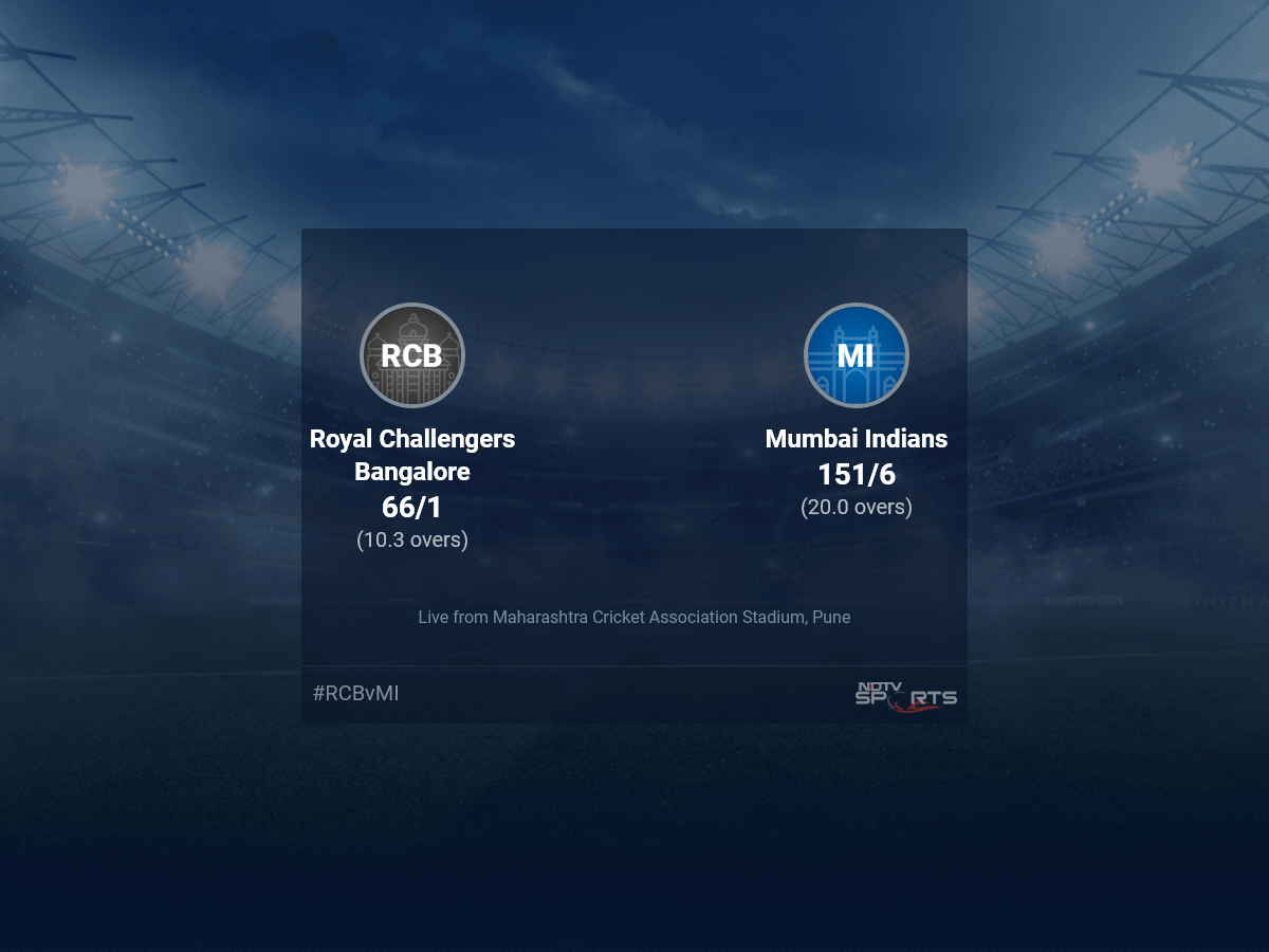 A dedicated team of experts bring you live score, live cricket score, live match update on Sports.NDTV.com. After 10.3 overs, Royal Challengers Bangalore, chasing a target of 152, are 66/1. The live updates of Royal Challengers Bangalore vs Mumbai Indians scorecard is also available. It is the perfect platform to follow your favourite teams in Indian Premier League 2022. Keep a track on your favourite batsmen and bowlers through Indian Premier League 2022 today match, ball by ball commentary, Royal Challengers Bangalore vs Mumbai Indians, Royal Challengers Bangalore vs Mumbai Indians live score, Royal Challengers Bangalore vs Mumbai Indians scorecard. Follow the excitement of the Indian Premier League 2022 on Sports.NDTV.com as you can follow live match updates and live cricket score through our platform.