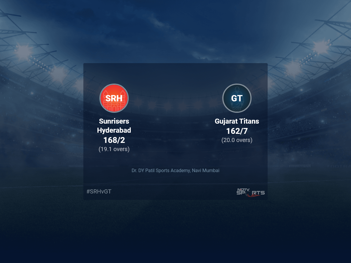 Follow the Indian Premier League 2022 live cricket score on Sports.NDTV.com. After 19.1 overs, Sunrisers Hyderabad, chasing a target of 163, are 168/2. Get live score, ball by ball commentary and much more. Keep track of Indian Premier League 2022 today match between Sunrisers Hyderabad and Gujarat Titans. Everything related to Sunrisers Hyderabad and Gujarat Titans match will be available on Sports.NDTV.com. Stay updated with Sunrisers Hyderabad vs Gujarat Titans live score. Do check for Sunrisers Hyderabad vs Gujarat Titans scorecard. You can get scorecard updates, match related facts. Get quick live updates with ads, Sports.NDTV.com, which is the perfect destination for live cricket score.
