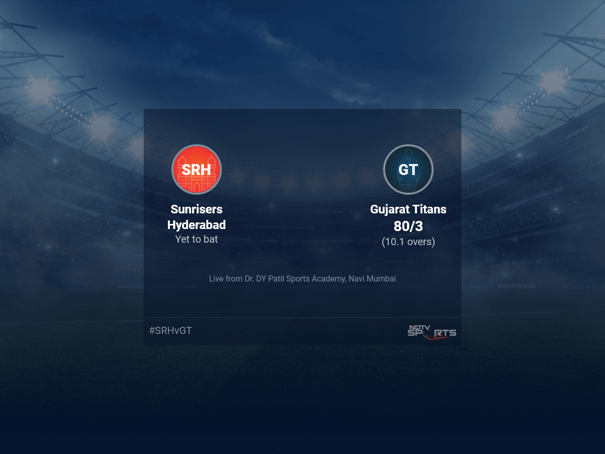 A dedicated team of experts bring you live score, live cricket score, live match update on Sports.NDTV.com. After 10.1 overs, Gujarat Titans are 80/3. The live updates of Sunrisers Hyderabad vs Gujarat Titans scorecard is also available. It is the perfect platform to follow your favourite teams in Indian Premier League 2022. Keep a track on your favourite batsmen and bowlers through Indian Premier League 2022 today match, ball by ball commentary, Sunrisers Hyderabad vs Gujarat Titans, Sunrisers Hyderabad vs Gujarat Titans live score, Sunrisers Hyderabad vs Gujarat Titans scorecard. Follow the excitement of the Indian Premier League 2022 on Sports.NDTV.com as you can follow live match updates and live cricket score through our platform.