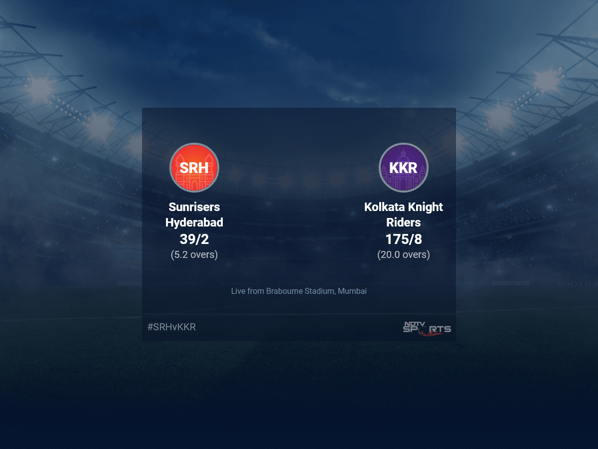 A dedicated team of experts bring you live score, live cricket score, live match update on Sports.NDTV.com. After 5.2 overs, Sunrisers Hyderabad, chasing a target of 176, are 39/2. The live updates of Sunrisers Hyderabad vs Kolkata Knight Riders scorecard is also available. It is the perfect platform to follow your favourite teams in Indian Premier League 2022. Keep a track on your favourite batsmen and bowlers through Indian Premier League 2022 today match, ball by ball commentary, Sunrisers Hyderabad vs Kolkata Knight Riders, Sunrisers Hyderabad vs Kolkata Knight Riders live score, Sunrisers Hyderabad vs Kolkata Knight Riders scorecard. Follow the excitement of the Indian Premier League 2022 on Sports.NDTV.com as you can follow live match updates and live cricket score through our platform.
