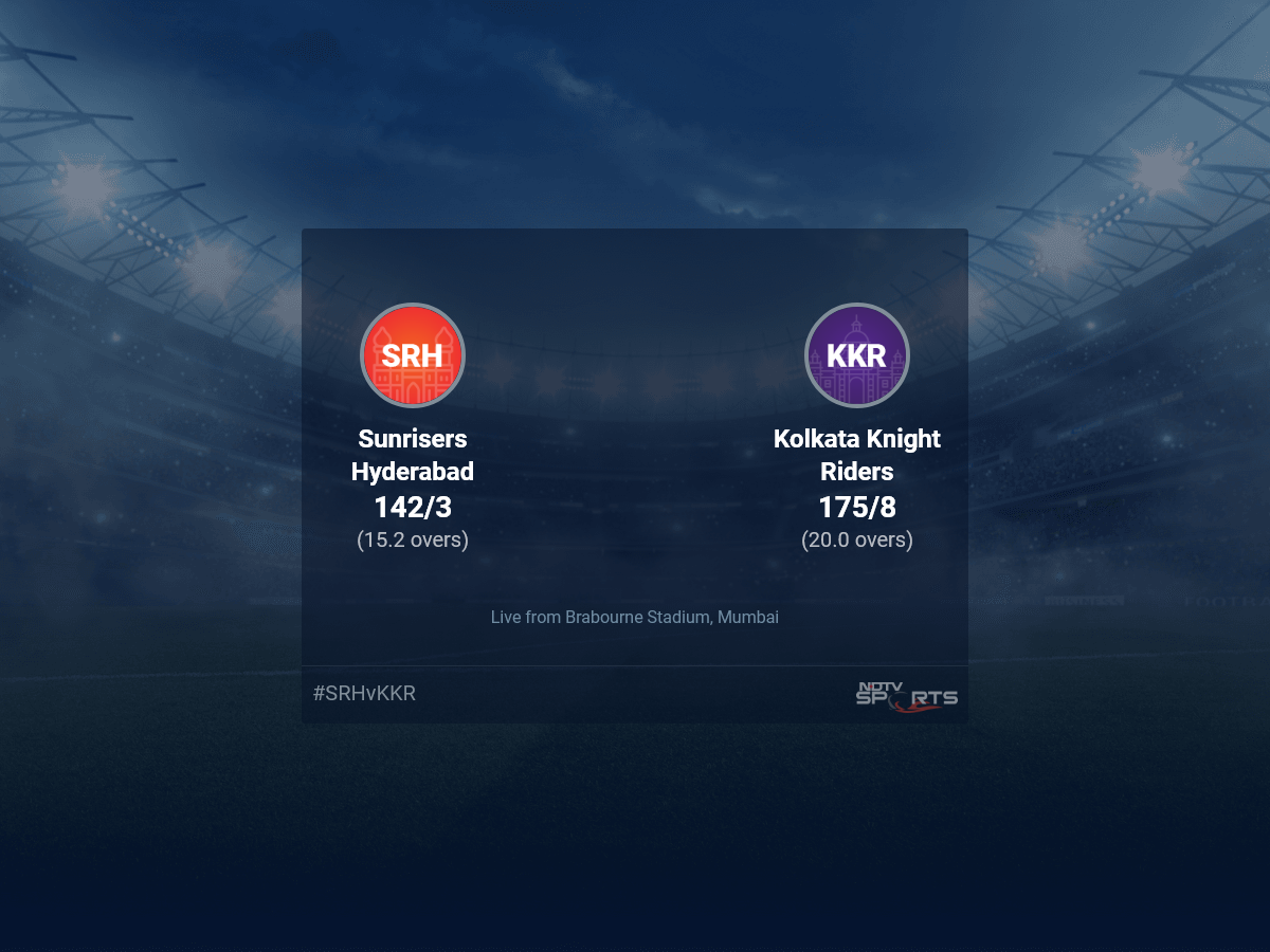 A dedicated team of experts bring you live score, live cricket score, live match update on Sports.NDTV.com. After 15.2 overs, Sunrisers Hyderabad, chasing a target of 176, are 142/3. The live updates of Sunrisers Hyderabad vs Kolkata Knight Riders scorecard is also available. It is the perfect platform to follow your favourite teams in Indian Premier League 2022. Keep a track on your favourite batsmen and bowlers through Indian Premier League 2022 today match, ball by ball commentary, Sunrisers Hyderabad vs Kolkata Knight Riders, Sunrisers Hyderabad vs Kolkata Knight Riders live score, Sunrisers Hyderabad vs Kolkata Knight Riders scorecard. Follow the excitement of the Indian Premier League 2022 on Sports.NDTV.com as you can follow live match updates and live cricket score through our platform.