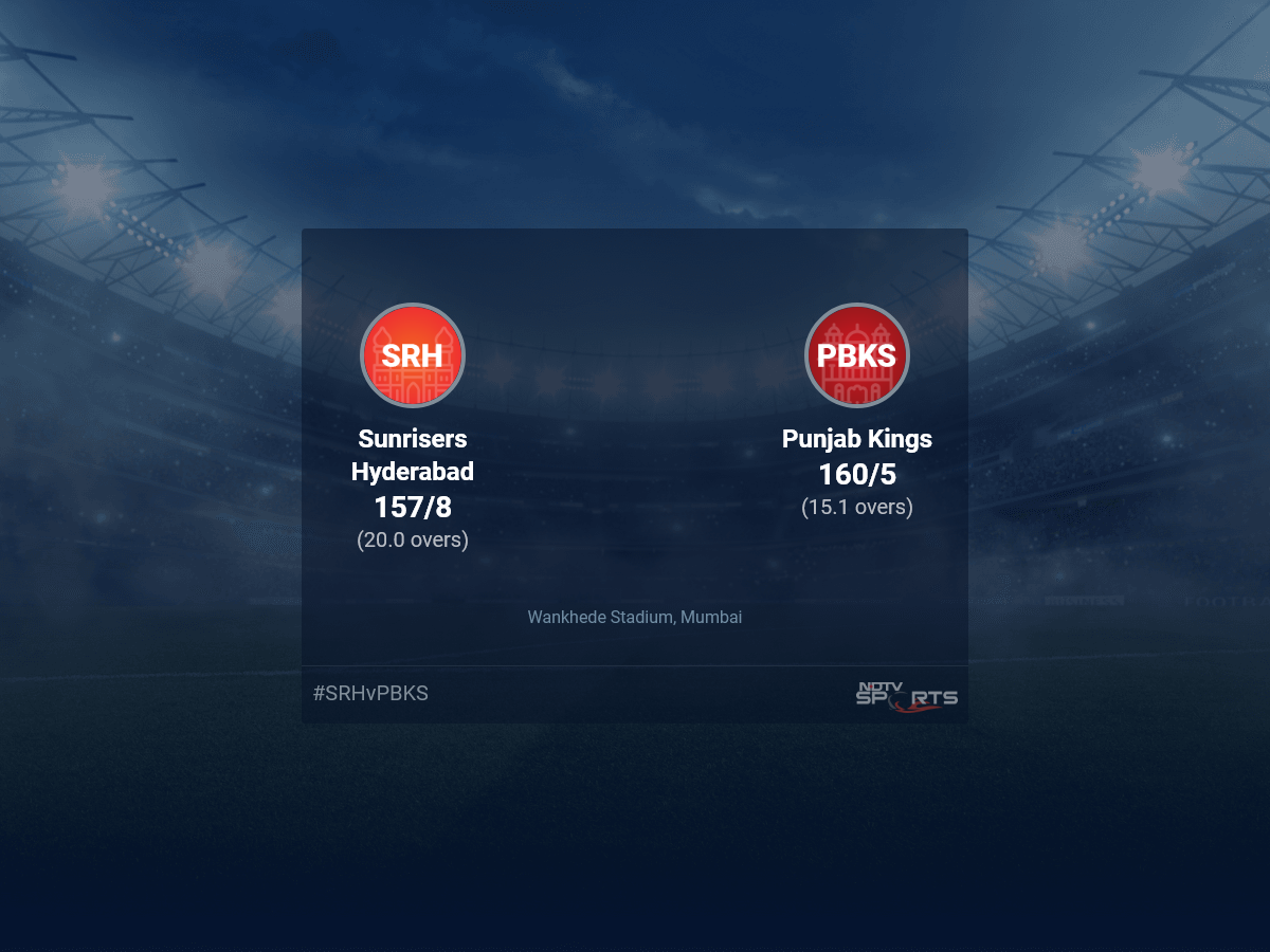 Follow the Indian Premier League 2022 live cricket score on Sports.NDTV.com. After 15.1 overs, Punjab Kings, chasing a target of 158, are 160/5. Get live score, ball by ball commentary and much more. Keep track of Indian Premier League 2022 today match between Sunrisers Hyderabad and Punjab Kings. Everything related to Sunrisers Hyderabad and Punjab Kings match will be available on Sports.NDTV.com. Stay updated with Sunrisers Hyderabad vs Punjab Kings live score. Do check for Sunrisers Hyderabad vs Punjab Kings scorecard. You can get scorecard updates, match related facts. Get quick live updates with ads, Sports.NDTV.com, which is the perfect destination for live cricket score.