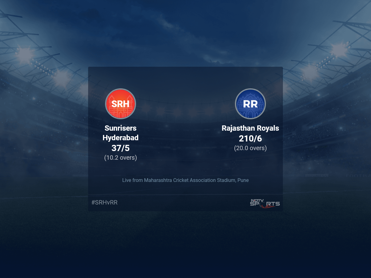 A dedicated team of experts bring you live score, live cricket score, live match update on Sports.NDTV.com. After 10.2 overs, Sunrisers Hyderabad, chasing a target of 211, are 37/5. The live updates of Sunrisers Hyderabad vs Rajasthan Royals scorecard is also available. It is the perfect platform to follow your favourite teams in Indian Premier League 2022. Keep a track on your favourite batsmen and bowlers through Indian Premier League 2022 today match, ball by ball commentary, Sunrisers Hyderabad vs Rajasthan Royals, Sunrisers Hyderabad vs Rajasthan Royals live score, Sunrisers Hyderabad vs Rajasthan Royals scorecard. Follow the excitement of the Indian Premier League 2022 on Sports.NDTV.com as you can follow live match updates and live cricket score through our platform.