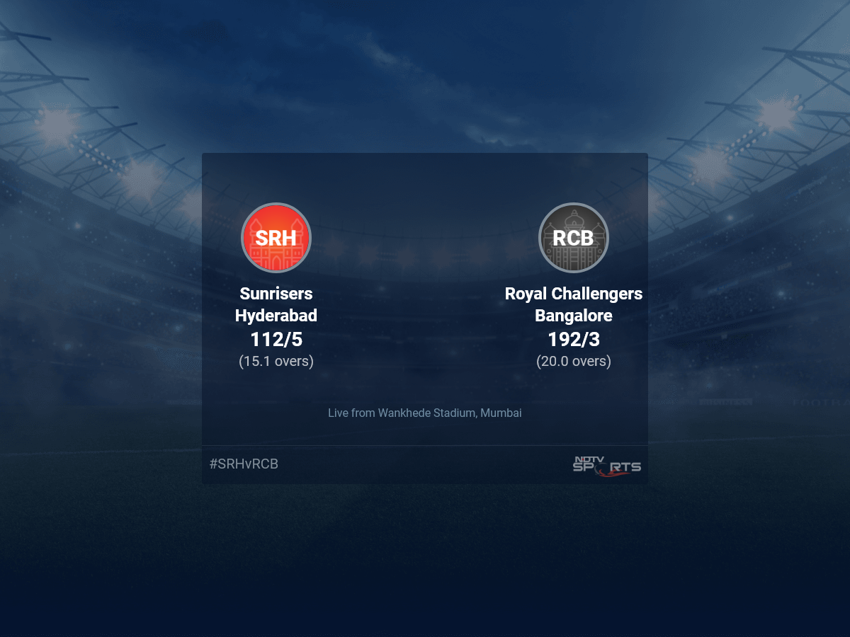 A dedicated team of experts bring you live score, live cricket score, live match update on Sports.NDTV.com. After 15.1 overs, Sunrisers Hyderabad, chasing a target of 193, are 112/5. The live updates of Sunrisers Hyderabad vs Royal Challengers Bangalore scorecard is also available. It is the perfect platform to follow your favourite teams in Indian Premier League 2022. Keep a track on your favourite batsmen and bowlers through Indian Premier League 2022 today match, ball by ball commentary, Sunrisers Hyderabad vs Royal Challengers Bangalore, Sunrisers Hyderabad vs Royal Challengers Bangalore live score, Sunrisers Hyderabad vs Royal Challengers Bangalore scorecard. Follow the excitement of the Indian Premier League 2022 on Sports.NDTV.com as you can follow live match updates and live cricket score through our platform.