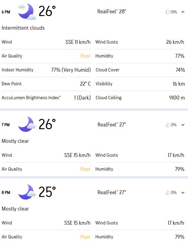 On Monday, only 3.4 overs were possible as persistent rain in Kolkata saw the match between KKR and Punjab Kings abandoned. Today, the forecast is much, much better. As per AccuWeather, there is only a 13% chance of rain after 6 PM, and that falls to 0% from 7 PM onwards.