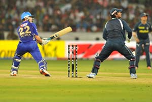 Thereafter Trivedi and Warne then put their side in control. Kumar Sangakkara has had a hectic week, losing the World Cup final, standing down as Sri Lanka captain and taking charge of the Deccan side. His stint with the new franchise got off to a poor start, though, as he edged an effort ball from Trivedi behind. When Bharat Chipli inside-edged a heave across the line, Deccan were in some strife and things got worse when Jaggi dragged Warne to long-on. Shane Warne evoked sights of his dominance over Daryl Cullinan as he reduced JP Duminy to groping and fumbling cluelessly against his sliders. Daniel Christian and Ravi Teja tried to inject some late momentum, but the final score of 137 meant the hapless Hyderabad crowd will continue to wait for a home win.