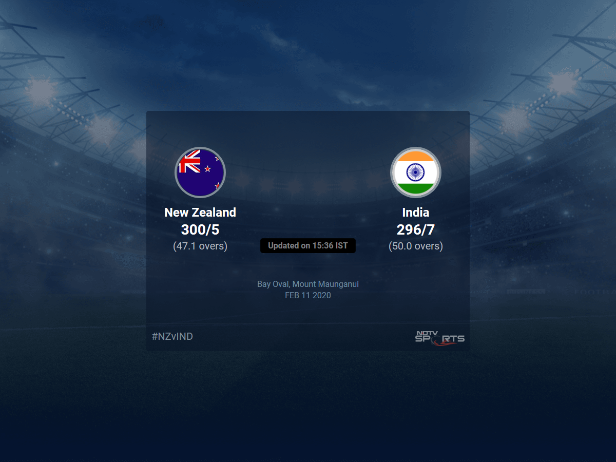A dedicated team of experts bring you live score, live cricket score, live match update on Sports.NDTV.com. After 47.1 overs, New Zealand, chasing a target of 297, are 300/5. The live updates of New Zealand vs India scorecard is also available. It is the perfect platform to follow your favourite teams in New Zealand vs India, 2020. Keep a track on your favourite batsmen and bowlers through New Zealand vs India, 2020 today match, ball by ball commentary, New Zealand vs India, New Zealand vs India live score, New Zealand vs India scorecard. Follow the excitement of the New Zealand vs India, 2020 on Sports.NDTV.com as you can follow live match updates and live cricket score through our platform.