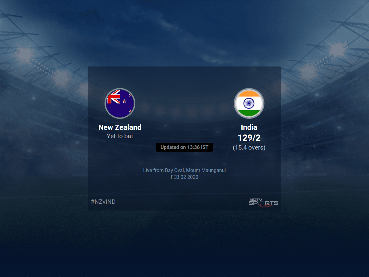 Follow the New Zealand vs India, 2020 live cricket score on Sports.NDTV.com. After 15.4 overs, India are 129/2. Get live score, ball by ball commentary and much more. Keep track of New Zealand vs India, 2020 today match between New Zealand and India. Everything related to New Zealand and India match will be available on Sports.NDTV.com. Stay updated with New Zealand vs India live score. Do check for New Zealand vs India scorecard. You can get scorecard updates, match related facts. Get quick live updates with ads, Sports.NDTV.com, which is the perfect destination for live cricket score.