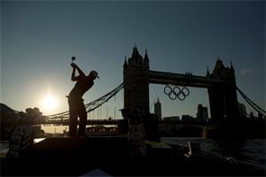 With a floating target in the River Thames and a set of giant Olympic rings overhead, Sergio Garcia and Dustin Johnson took turns whacking balls at a makeshift green.