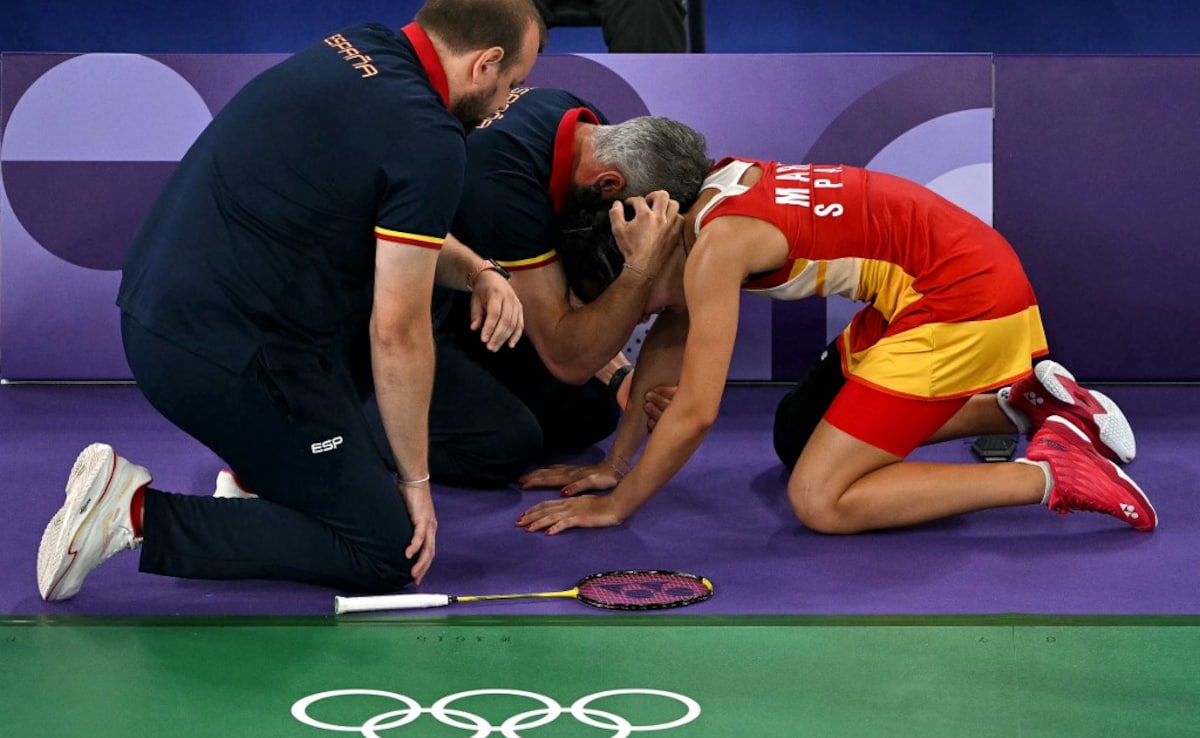 Devastated former Olympic champion Carolina Marin withdrew in tears from her badminton semi-final on Sunday after her right knee buckled in distressing scenes. Marin, who won women's singles gold at the Rio 2016 Games, was on track to reach the final but collapsed midway through the second game against China's He Bingjiao. Coaches and He rushed to her side as she lay on the ground for several minutes, clutching her leg. She eventually got up and walked off the court then resumed wearing a support but she could barely move, losing the next two points before falling to the ground again and retiring. Marin, the fourth seed in Paris, won the first game 21-14 and was leading 10-6 in the second before she left the court in tears before going for a medical check.