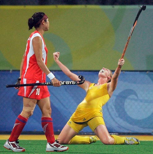 Australia's Sarah Young celebrates scoring in front of Korea's Park Jeong Sook during the women's field hockey competition at the Olympic Hockey Center.