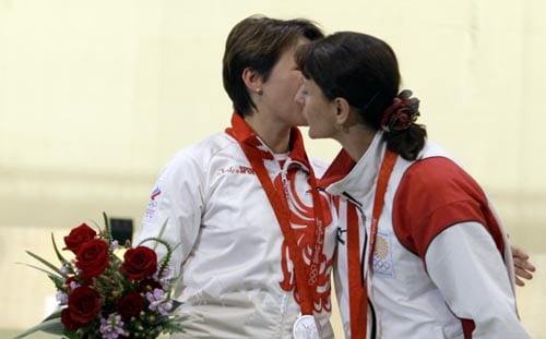 Russia's Natalia Paderina, left, and Georgia's Nino Salukvadze hug during the medal ceremony after the women's 10 meter air pistol final in Beijing. Paderina won the silver medal and Salukvadze won bronze. Georgia and Russia are at war at the moment.